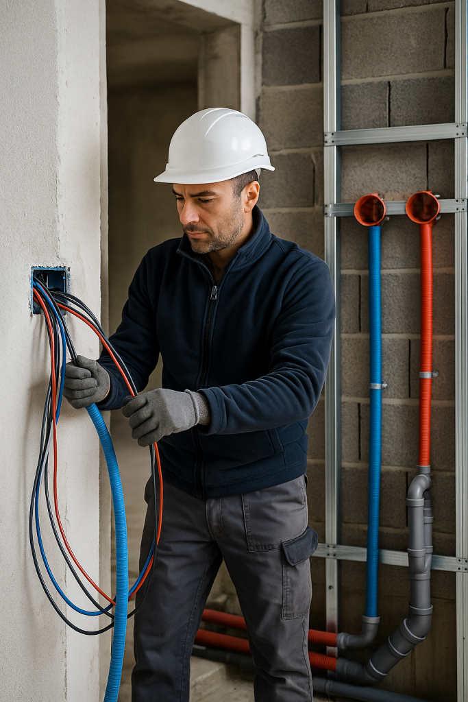 Nous intégrons toutes les installations techniques et l’agencement intérieur : création de réseaux d’eau et d’électricité, montage de cloisons, pose de plafonds… avec conformité et sécurité.